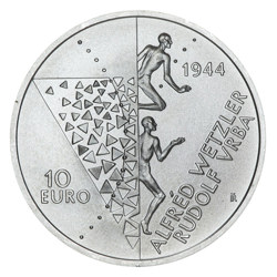 Slovenská stříbrná euromince byla vyražena v kvalitě standard u příležitosti 80. výročí zprávy Vrby a Wetzlera o německých vyhlazovacích táborech.
