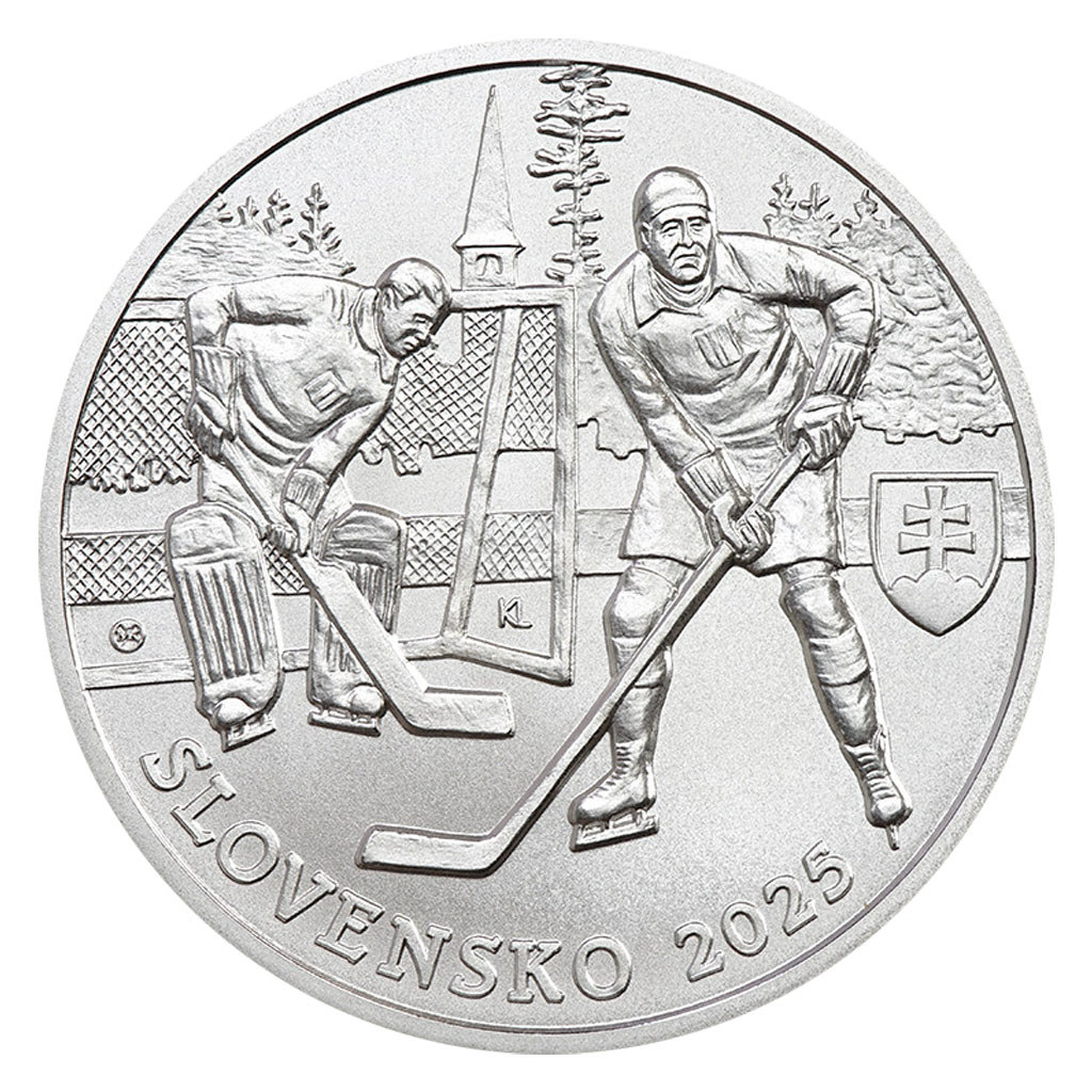Medailér Karol Ličko věnoval reverzní stranu mince hokejistovi vklíněnému do přírodní scenérie. Dalšího hokejistu a brankáře pak najdete na averzní straně – i oni jsou obklopeni zelení a v pozadí je patrný autentický fragment kostelní věže. Kompozici dotváří text SLOVENSKO, státní znak, rok emise 2025, nominální hodnota 10 EURO a opis MAJSTROVSTVÁ EURÓPY V HOKEJI 1925.
