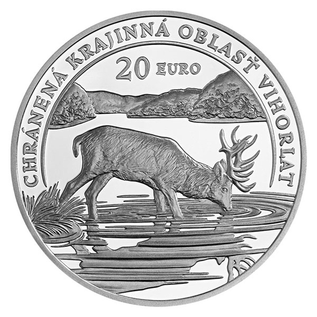 Medailér Mgr. art. Roman Lugár věnoval reverzní stranu mince jelenovi, který pije z Morského oka. Také averzní strana je věnována živočichům, které najdeme v okolí sopečného jezera – rosničce zelené a vážce. Reliéf mince dotváří slovenský státní znak, nominální hodnota 20 EURO a texty CHRÁNENÁ KRAJINNÁ OBLASŤ VIHORLAT, SLOVENSKO, 2023.