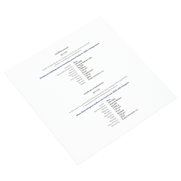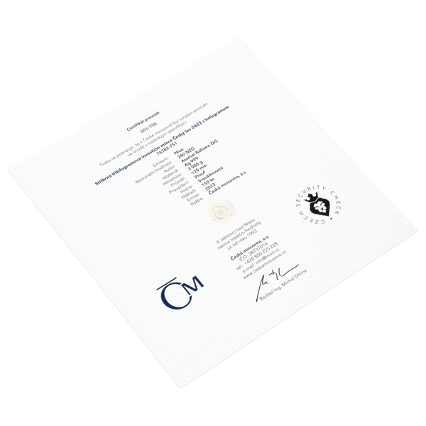 Světové investiční mince bývají věnovány silným národním symbolům a ani „Český lev“, který je první ražbou svého druhu určenou pro český trh, není výjimkou. Hmotnost jedinečné mince s ročníkem 2023, která je opatřena unikátním bezpečnostním hologramem, činí tři kilogramy ryzího stříbra.