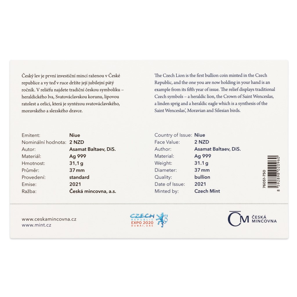 Světové investiční mince bývají věnovány silným národním symbolům a ani „Český lev“, který je první ražbou svého druhu určenou pro český trh, není výjimkou. Hmotnost stříbrné mince České mincovny činí jednu trojskou unci.