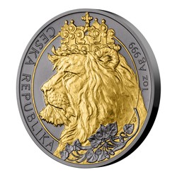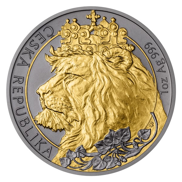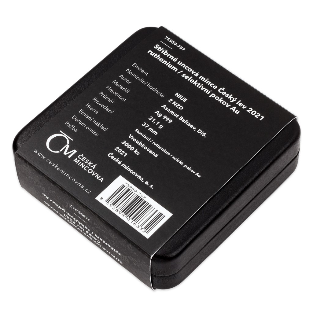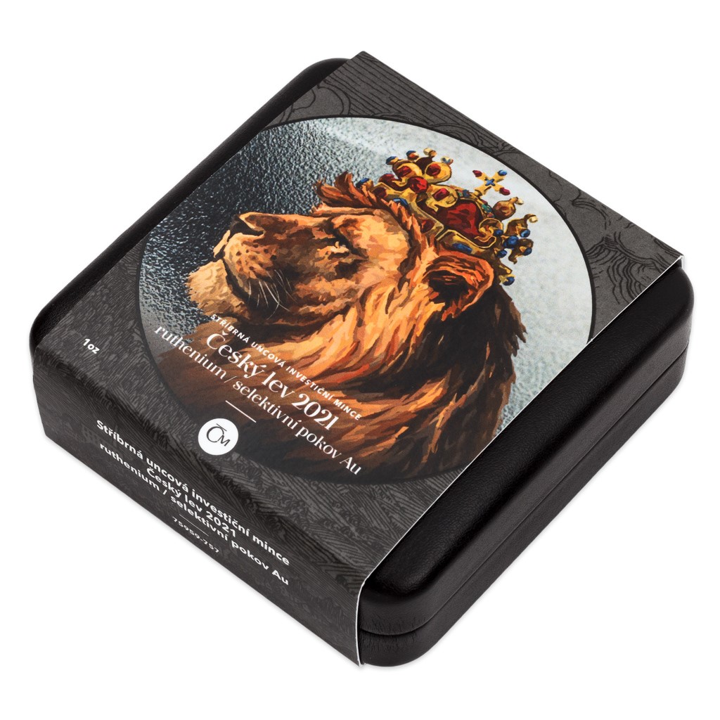Mimořádná varianta investiční mince Český lev vyniká promyšlenou hrou barev, jež se v mincovnictví často nevidí. Stříbrná ražba je pokryta vrstvičkou šedočerného ruthenia – ušlechtilého materiálu, který je nejvzácnějším z triády platinových kovů. Ústřední reliéf je pak ještě selektivně pozlacen, což minci propůjčuje výrazný kontrastní vzhled.