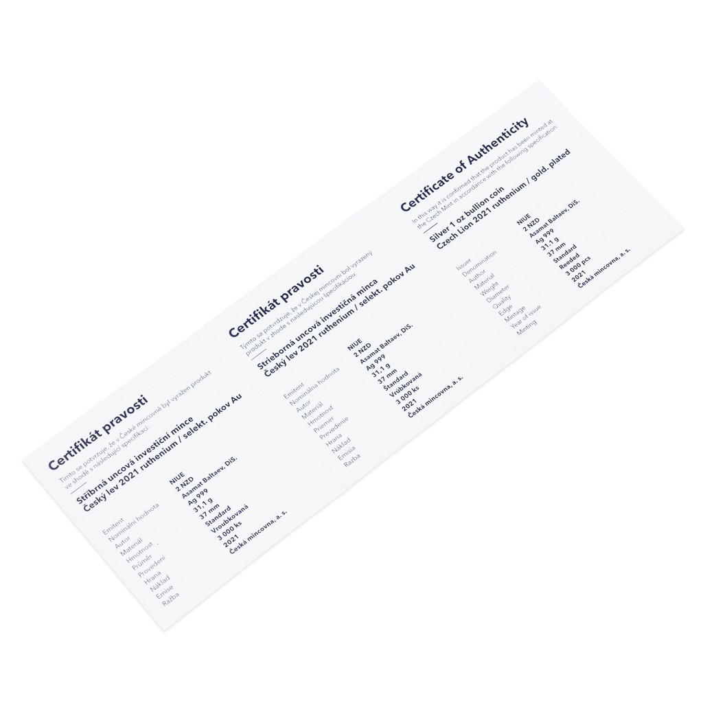 Stříbrná uncová investiční mince Český lev 2021 ruthenium selekt. pokov Au stand
