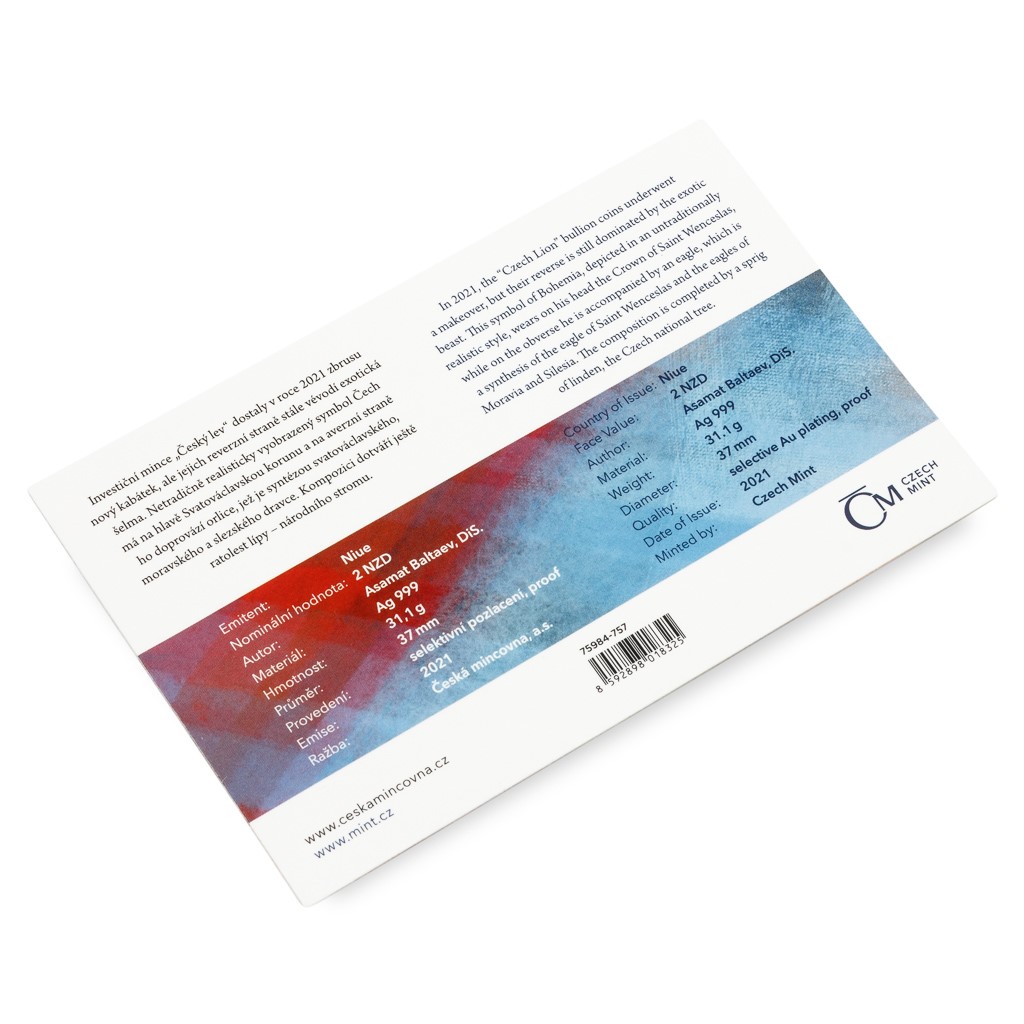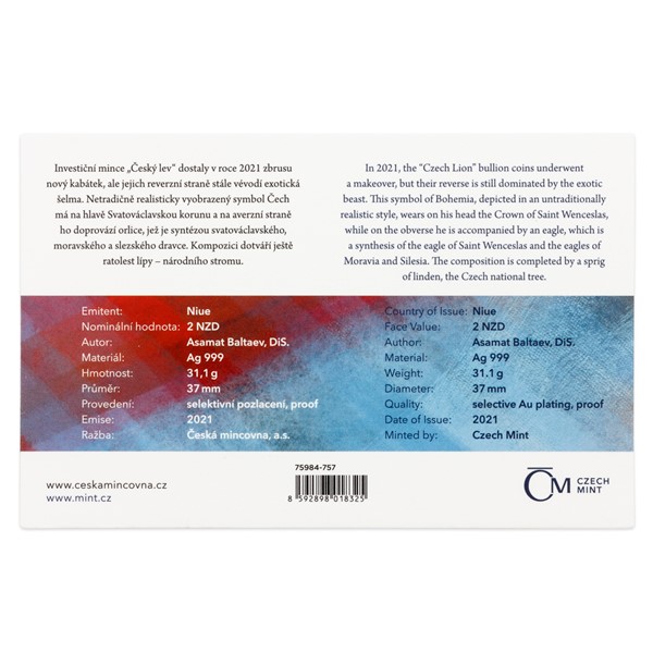 Čeští lvi – investiční mince České mincovny ražené pod zahraniční licencí – sice slouží k uložení peněžních prostředků do drahých kovů, ale jejich propracovaný reliéf láká také každého, kdo chce rozšířit svou numismatickou sbírku nebo věnovat výjimečný dárek. Krásu stříbrné mince s ročníkem 2021 podtrhuje selektivní pozlacení.