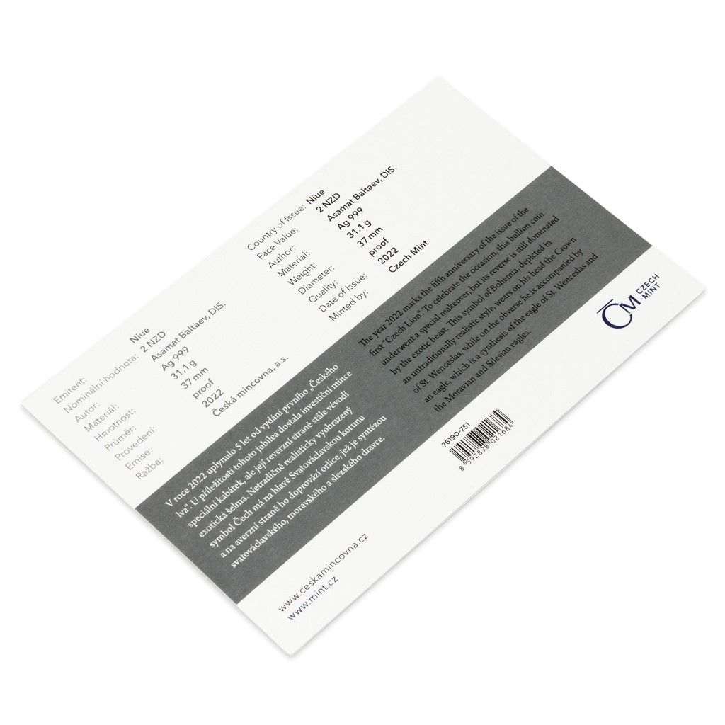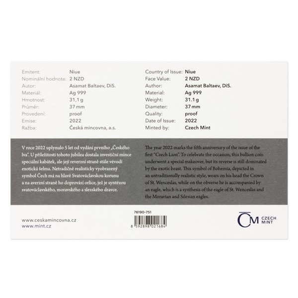 Světové investiční mince bývají věnovány silným národním symbolům a ani „Český lev“, který je první ražbou svého druhu určenou pro český trh, není výjimkou. Hmotnost stříbrné mince České mincovny s ročníkem 2022 činí jednu trojskou unci.