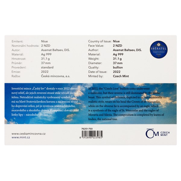 Světové investiční mince bývají věnovány silným národním symbolům a ani „Český lev“, který je první ražbou svého druhu určenou pro český trh, není výjimkou. Hmotnost stříbrné mince České mincovny s ročníkem 2022 činí jednu trojskou unci.