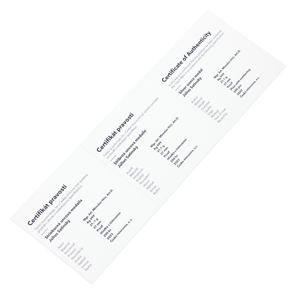 Július Satinský byl legendou slovenské kultury. Právem mu proto náleží pamětní medaile České mincovny vyražená z ryzího stříbra.