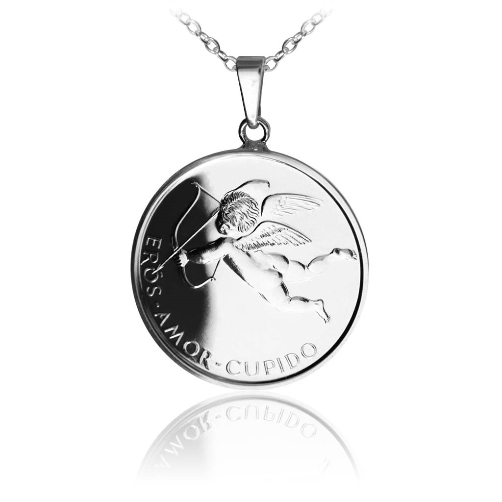 Amor či Erós či Cupido, syn boha války Area a bohyně lásky a krásy Afrodity. Ztvárnění medaile je motivováno antickými bájemi. Na averzní straně je Erós bůh lásky. Na reverzní straně je kompozice ženské postavy s motýlími křídly, která má znázorňovat Psyché - ženu krásnější než Afrodita, která si podle pověsti po útrapách nakonec Eróse vzala a Zeus ji dal vypít nápoj nesmrtelnosti. Medailonek je zavěšen na 50 cm dlouhém stříbrném řetízku „Anker“.