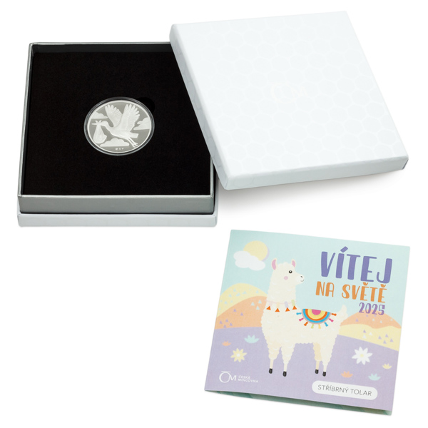 Stříbrný tolar se v roce 2025 inspiroval pověstí, která vypráví o tom, odkud se berou novorozené děti. Medailérka Veronika Prokopová, DiS., věnovala averzní stranu čápovi, který v zobáku nese uzlíček s miminkem. Reverzní strana je pak vyhrazena pro vyrytí textu, který může mít podobu osobního vzkazu, jména, data narození, … – fantazii se meze nekladou. Jediným limitem je rozsah textu.