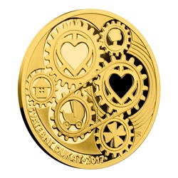 Takový je i nový zlatý dukát České mincovny pro rok 2017. Autorem jeho averzní strany je nadaný medailér Roman Shamilyan – věnoval ji vtipné symbolice hodinového strojku, který evokuje spolehlivě šlapající manželství. Jednotlivá ozubená kolečka skrývají srdce a čtyřlístek – symboly lásky a štěstí – a také dům, strom a kočárek odkazující na staré rčení „postav dům, zasaď strom a zploď syna“. Reverzní strana patří pergamenovému svitku, na který bude vyryto vaše osobní věnování či jiný text dle vašeho přání o rozsahu 3 řádků po 10 znacích včetně mezer.