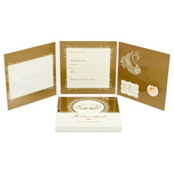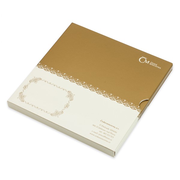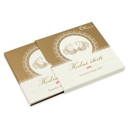 Tematické balení v podobě knížečky s přebalem obsahuje vedle zlatého dukátu také prostor pro vlepení svatební fotografie a vepsání údajů o velkém dni novomanželů.