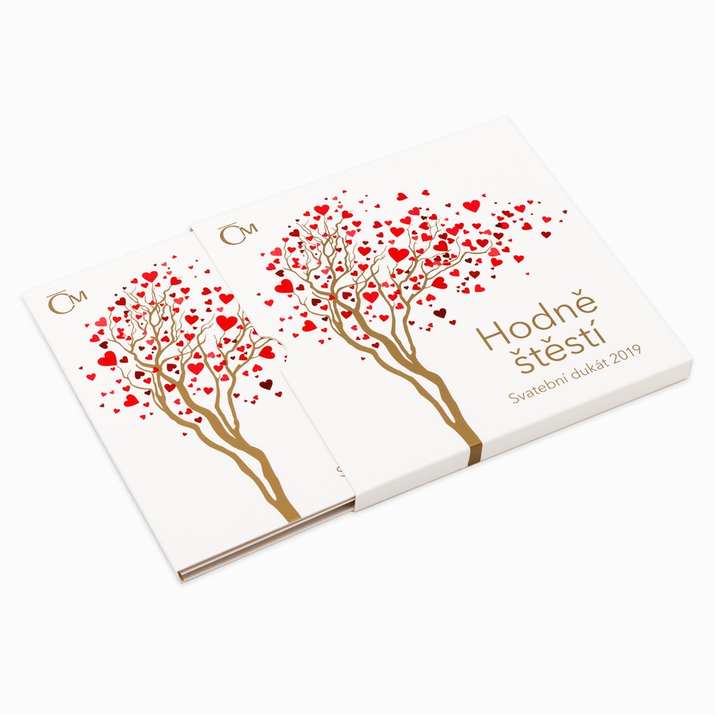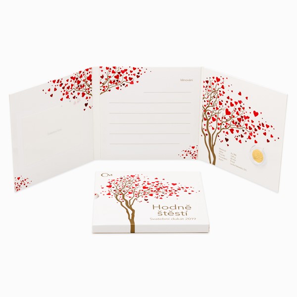 Zlatý Svatební dukát České mincovny je vkusným darem pro novomanžele, který v sobě spojuje originální symboliku, hodnotu drahého kovu a citovou hodnotu v podobě vyrytého věnování.