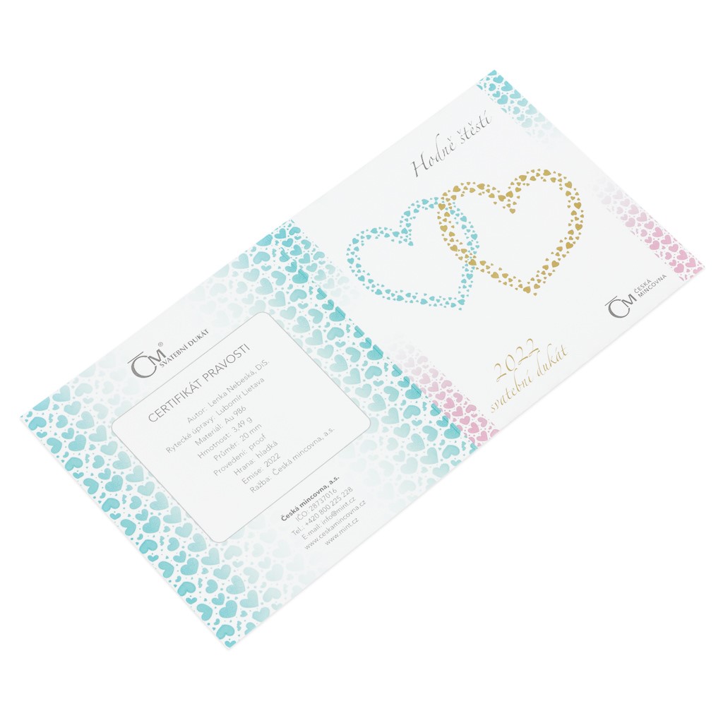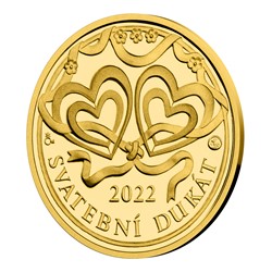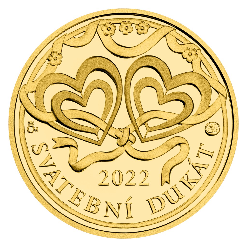 Takový je i zlatý dukát České mincovny pro rok 2022. Jeho autorkou se stala medailérka Lenka Nebeská, DiS. Averzní stranu věnovala propracované kompozici, která se skládá z nápisu SVATEBNÍ DUKÁT 2022 a dvou dvojic srdcí propojených osičkami, mezi kterými se proplétá ozdobná stužka. Stužka protkaná květinami se objevuje také na reverzní straně dukátu, kde vymezuje prostor pro vyrytí osobního věnování či jiného textu dle vašeho přání o rozsahu 3 řádků po 10 znacích včetně mezer.