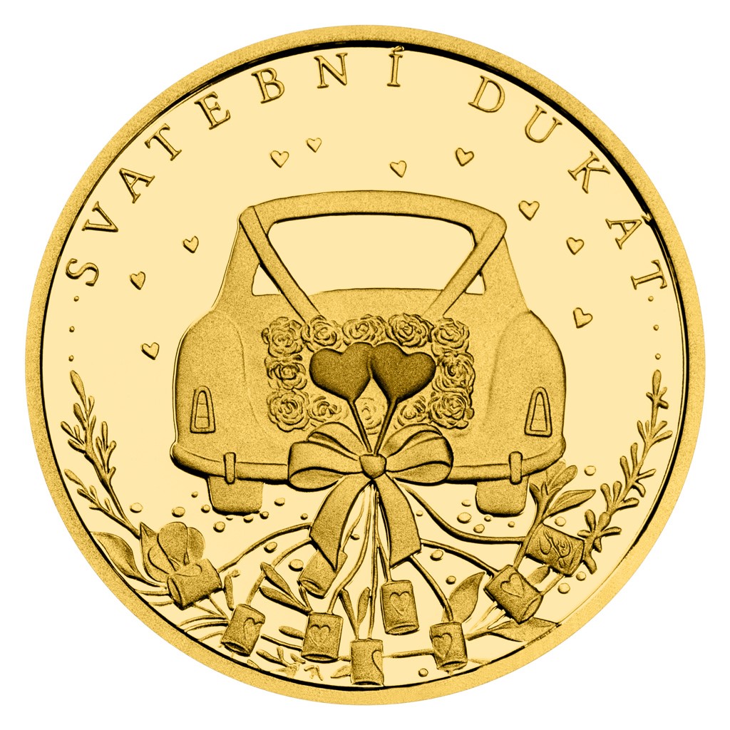 Svatební auto ozdobené stužkami, květinami, balónky a plechovkami najdete na averzní straně zlatého dukátu, který je dílem medailérky Ludmily Kracíkové, DiS. Kompozici averzu dotváří opis SVATEBNÍ DUKÁT. Auto najdete i na reverzní straně. V kufru veze dva prstýnky a na střeše mu sedí dva zamilovaní ptáčci – nevěsta se závojem a ženich s cylindrem.