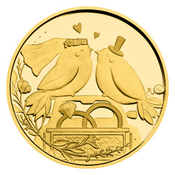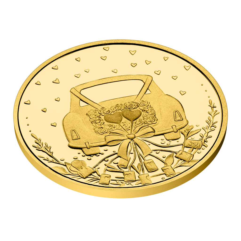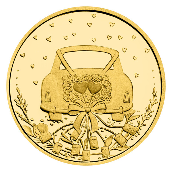 Svatební auto ozdobené stužkami, květinami, balónky a plechovkami najdete na averzní straně zlatého dukátu, který je dílem medailérky Ludmily Kracíkové, DiS. Auto najdete i na reverzní straně. V kufru veze dva prstýnky a na střeše mu sedí dva zamilovaní ptáčci – nevěsta se závojem a ženich s cylindrem.