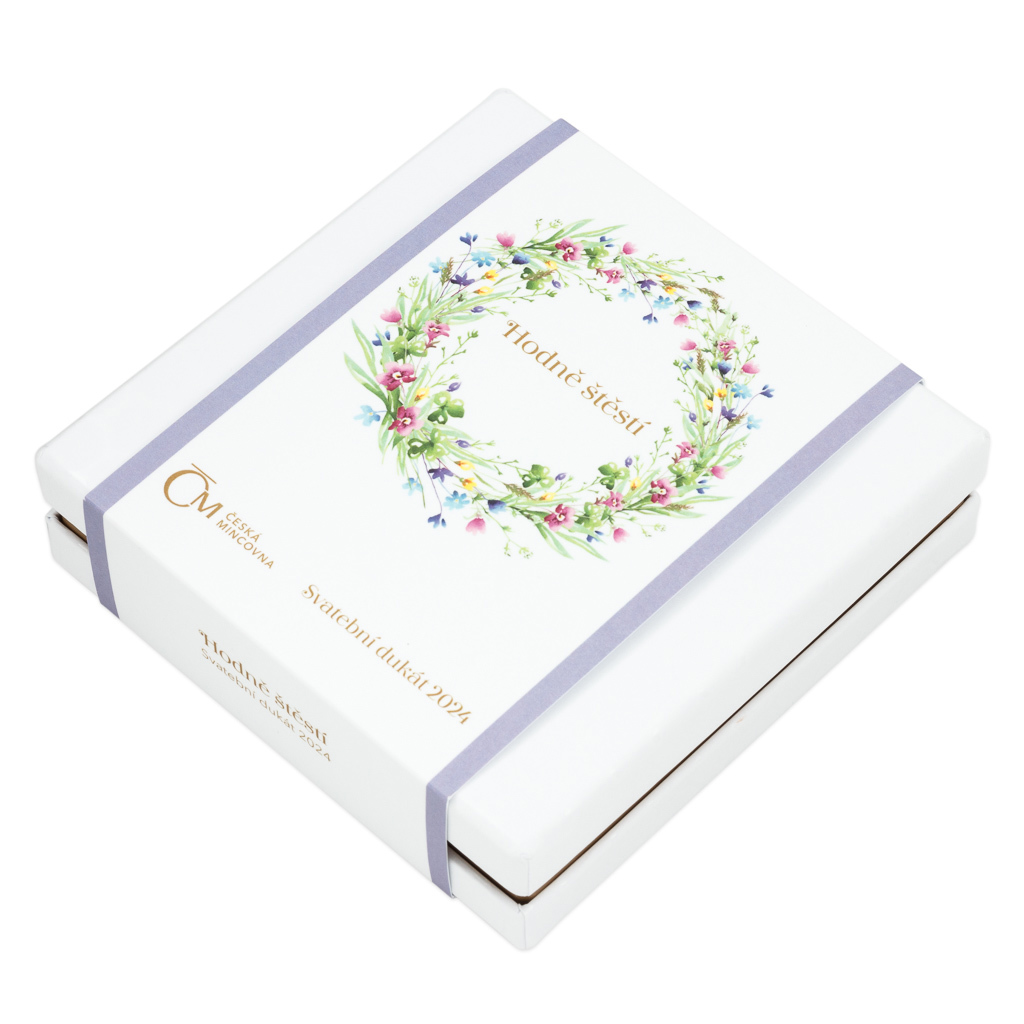 Dárkové balení obsahuje vedle dukátu také certifikát pravosti s prostorem pro vepsání osobního věnování. Nepřehlédněte ani další varianty svatebního penízku – v naší nabídce na rok 2024 najdete dva různé drahé kovy i verze, na které lze vyrýt věnování.