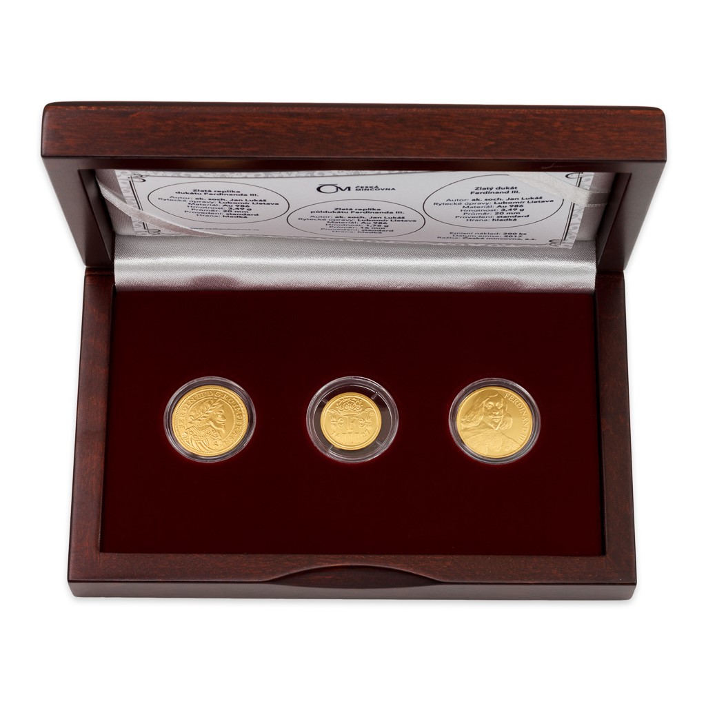 Jubilejní sada věnovaná Ferdinandu III. předkládá hned tři zlaté ražby, všechny v podání předního akademického sochaře Jana Lukáše. První je novodobým dukátem, jehož motivem je korunovace Habsburka českým králem – averz nese panovníkův portrét, reverz svatováclavskou korunu. Druhá ražba je rovněž připomínkou české korunovace, jedná se však o repliku historického korunovačního půldukátu z 25. listopadu roku 1627. Třetí ražbou je pak replika dukátu Ferdinanda III. z mincovny v Praze z roku 1648, kdy skončila třicetiletá válka.