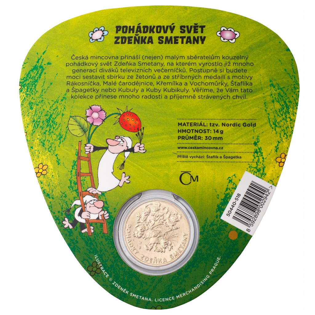 Každý žeton z tohoto cyklu je balen ve veselém tematickém blistru na motivy Smetanových předloh. Žeton je z obou stran provázen proslulými hrdiny z jeho příběhů. Averz autor věnoval Křemílkovi s Vochomůrkou s kolorovaným prvkem jahod, reverz nabízí přehlídku dalších světoznámých animovaných postaviček Zdeňka Smetany. Žetony s pohádkovou tématikou jsou vítanou ozdobou dětských sbírek, milou pozorností a možná i prvními vlaštovkami budoucích velkolepých kolekcí. Potěšte svého malého numismatika předmětem, který odráží jeho pestrý bezstarostný svět!