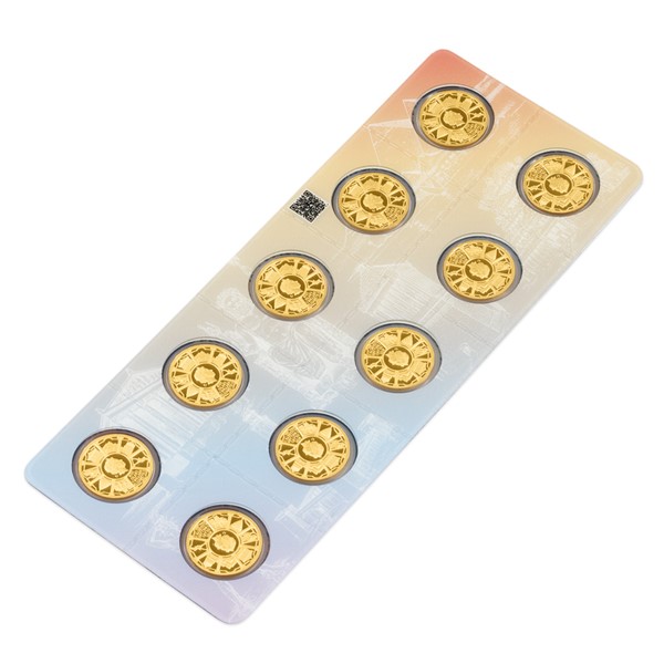 Deset identických mincí je zataveno do speciálního balení. To je perforováno, aby v případě potřeby mohlo být pohodlně rozděleno na deset částí.