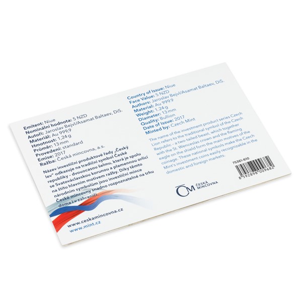 Vlastenecký reliéf investičních mincí České mincovny je inspirován tradičními symboly České republiky: reverzní strana mince nese realisticky zpracovaného dvouocasého lva střežícího Svatováclavskou korunu a svatováclavskou orlici na štítu. Averzní strana mince pak obsahuje atributy ostrova Niue (portrét a jméno královny Alžběty II., rok emise 2017 a nominální hodnotu 5 DOLLARS (NZD)), který České mincovně poskytuje licenci k ražbě vlastních mincí. Kompozici averzu doplňuje ještě lipová ratolest. Mince má hned dva autory. Navrhl ji přední výtvarník Jaroslav Bejvl, který však ve věku 75 let zemřel a už ji nestihl dokončit. V jeho díle proto pokračoval nadaný medailér Asamat Baltaev, DiS.