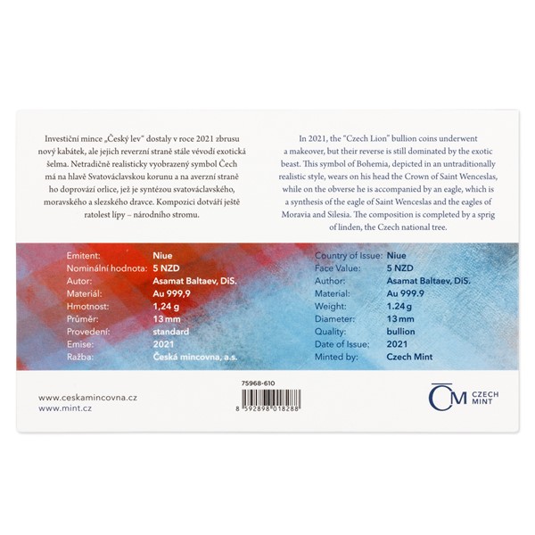 Světové investiční mince bývají věnovány silným národním symbolům a ani „Český lev“, který je první ražbou svého druhu určenou pro český trh, není výjimkou. Hmotnost zlaté mince České mincovny činí jednu pětadvacetinu trojské unce.