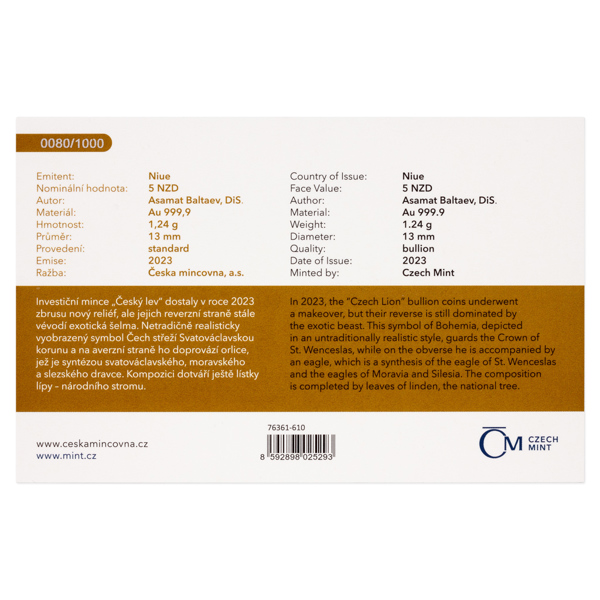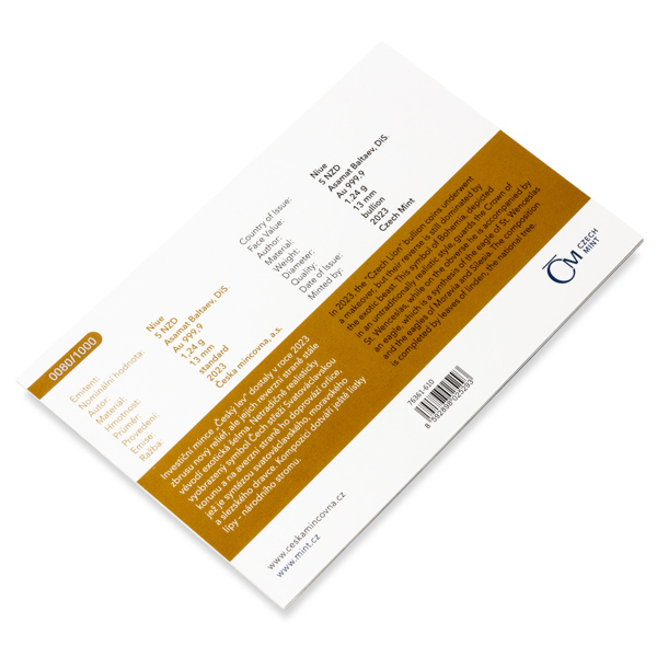 Světové investiční mince bývají věnovány silným národním symbolům a ani „Český lev“, který je první ražbou svého druhu určenou pro český trh, není výjimkou. Hmotnost zlaté mince České mincovny s ročníkem 2023 činí jednu pětadvacetinu trojské unce.