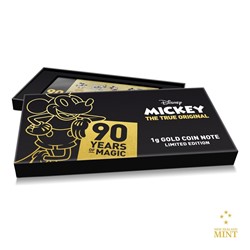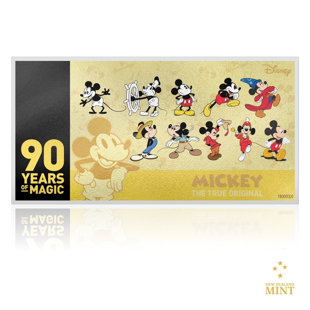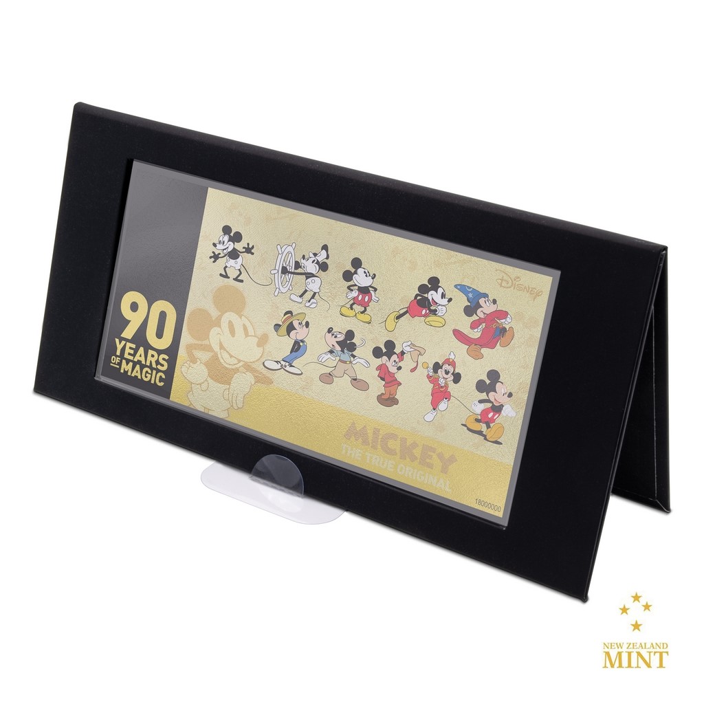 I když na to nevypadá, Mickey Mouse oslavil devadesáté narozeniny. Na památku tohoto výročí vyšla speciální „coin note“ – mince v podobě bankovky vyrobená ze zlata.