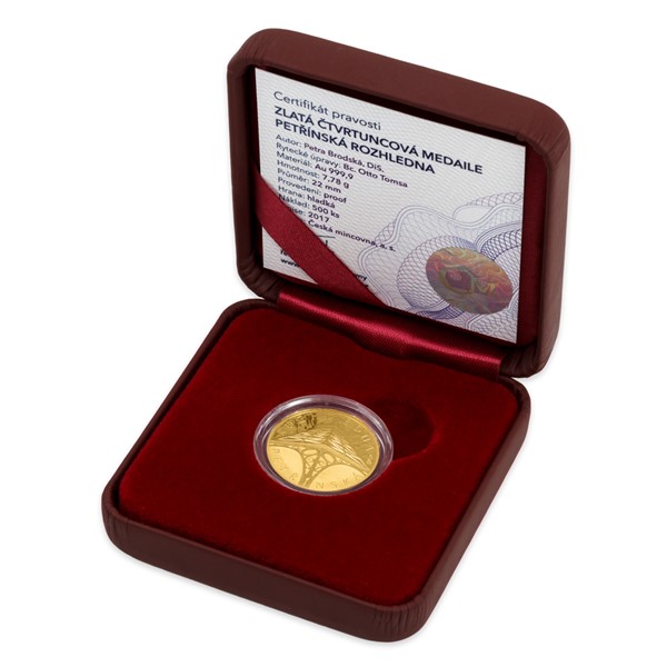 V sérii pamětních medailí vyražených z jedné čtvrtiny unce ryzího zlata se postupně objevují nejkrásnější a nejzajímavější vyhlídkové věže ze všech koutů České republiky. Není proto divu, že se dostalo i na pražskou Petřínskou rozhlednu.