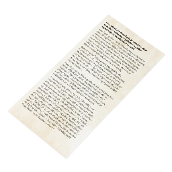 Robota byla těžká poddanská práce, při které se lidé lopotili na panstvích vrchnosti. Otrocký přežitek feudálního systému byl zrušen v polovině 19. století, ale masy přesto nepřestávaly toužit po světě bez dřiny. Zdálo se, že jejich sen mohou splnit výdobytky všudypřítomné průmyslové revoluce, ale ne všichni byli tak optimističtí. Jedním ze skeptiků, kteří na počátku 20. století varovali před nástrahami bezmyšlenkovitého vzývání vědeckého pokroku, byl spisovatel, novinář a dramatik Karel Čapek. Symbol prvorepublikové kultury a vzdělanosti se zapsal do dějin nejen všestranným literárním talentem, ale také nadčasovými myšlenkami, které promítl do řady děl s vědeckofantastickou tematikou. Jejich ústředním motivem bývá převratný objev, který lidstvu slibuje netušené možnosti, ale ve skutečnosti ho vede do záhuby. Například antiutopické drama R.U.R. z roku 1920 se odehrává v budoucnosti, kdy lidé dokázali vytvořit své dokonalé umělé repliky, jež je mají navždy osvobodit od fyzické námahy. Svět je záhy zaplaven otrockou pracovní silou, umělých bytostí je více než lidí a je jen otázkou času, kdy se výtvory vzbouří proti svým pánům… Syntetickým dělníkům se ve fiktivním světě Karla Čapka říká „roboti“. S tímto trefným pojmenováním, které se rozšířilo do všech světových jazyků a které je dnes nedílnou součástí běžné mluvy, však nepřišel sám dramatik, ale jeho starší bratr – malíř Josef, se kterým Karel často umělecky spolupracoval.