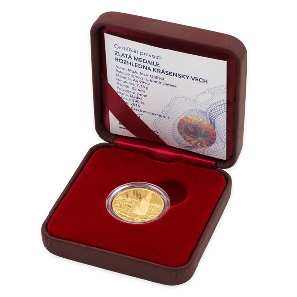 Vyhledávaná série Rozhledny od České mincovny dosud prostřednictvím pamětních medailí z ryzího zlata představila pět nádherných staveb. Na konci roku 2015 se po bok rozhleden Žalý, Cvilín, Josefova věž na Kleti, Babylon a Štěpánka zařadila další jedinečná vyhlídková věž – Krásenský vrch. Její majestátnost obzvláště vyniká v lesku špičkové kvality proof zlaté čtvrtuncové medaile.