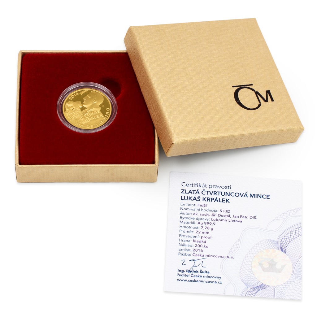 Autorem zlaté pamětní mince oslavující tento úspěch je ak. soch. Jiří Dostál, který má ve svém portfoliu velké množství ražeb našich předních sportovců – například hokejového brankáře Dominika Haška či rychlobruslařky Martiny Sáblíkové. „Lukáš má moc hezkou hlavu,“ říká zkušený medailér, který se se zápasníkem setkal osobně, aby mohl jeho charakteristické rysy zpracovat co nejvěrněji. Reverzní straně mince dominuje vyobrazení olympionika z profilu s pěstmi pozvednutými v triumfálním gestu, které je doplněno českou vlajkou a koláží složenou z nápisů LUKÁŠ KRPÁLEK – RIO DE JANEIRO – 2016 – JUDO – ZLATÁ MEDAILE. Averzní strana ražby patří emitentovi, který České mincovně nově poskytuje licenci pro vydávání mincí s žijícími osobnostmi. Znak tichomořského souostroví FIJI je doplněn rokem emise 2016 a nominální hodnotou FIVE DOLLARS (FJD).