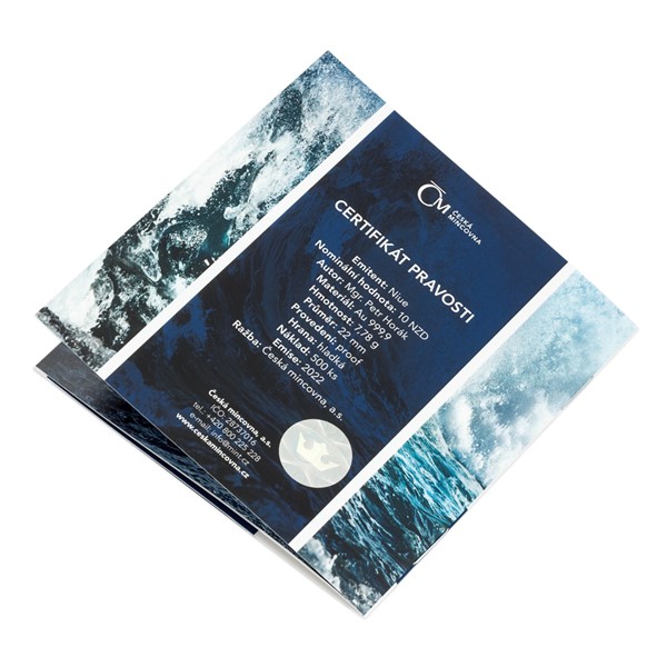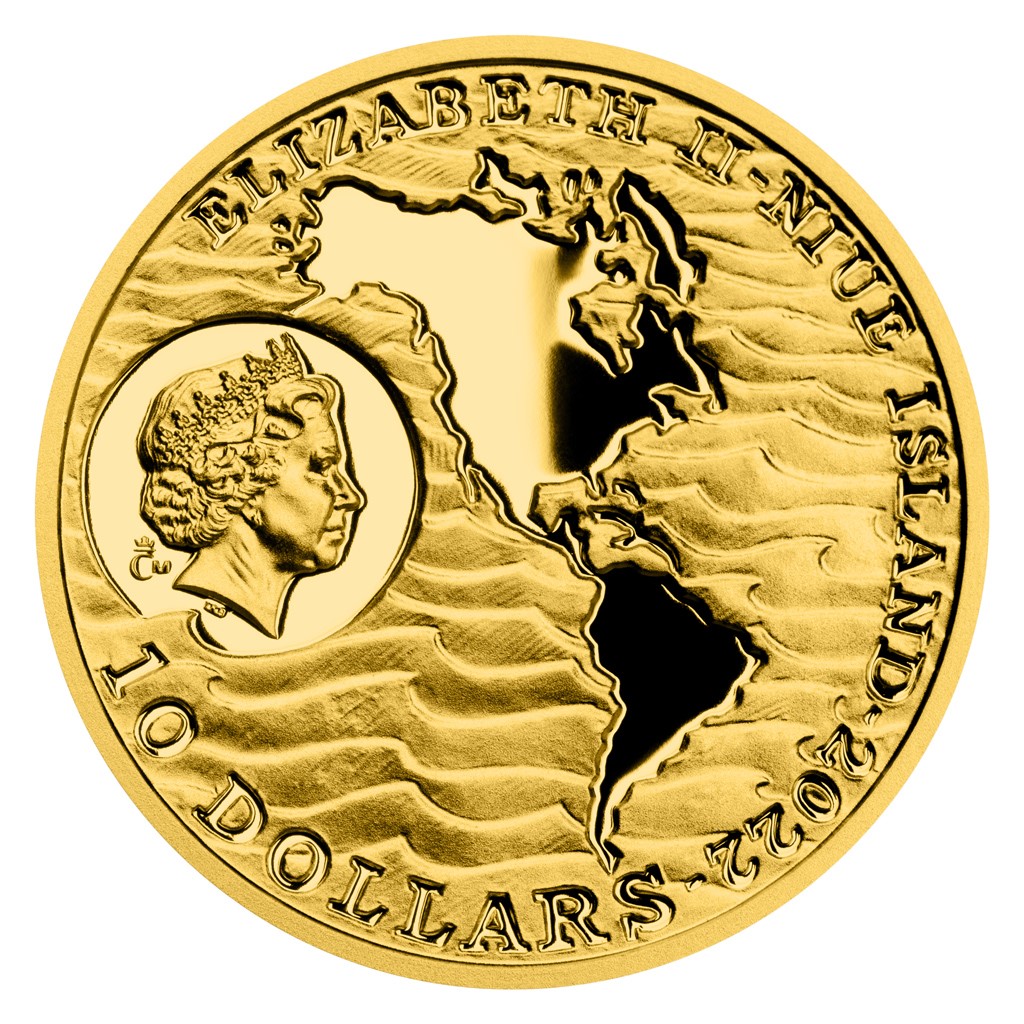 Reverzní strana pamětní mince, která je dílem medailéra Mgr. Petra Horáka, předkládá portrét Kryštofa Kolumba z profilu. Mincovní plochu vyplňují vlny, na kterých se kolébají tři španělské plachetnice. Vlny, které obklopují Severní a Jižní Ameriku, najdete také na averzní straně, jež je společná celému cyklu objevitelských mincí. Protože licenci k vydávání pamětních mincí České mincovny poskytuje tichomořský ostrov Niue, nese averz ještě jeho nezbytné atributy – jméno a portrét královny Alžběty II., nominální hodnotu 10 DOLLARS (NZD) a rok vydání 2022.