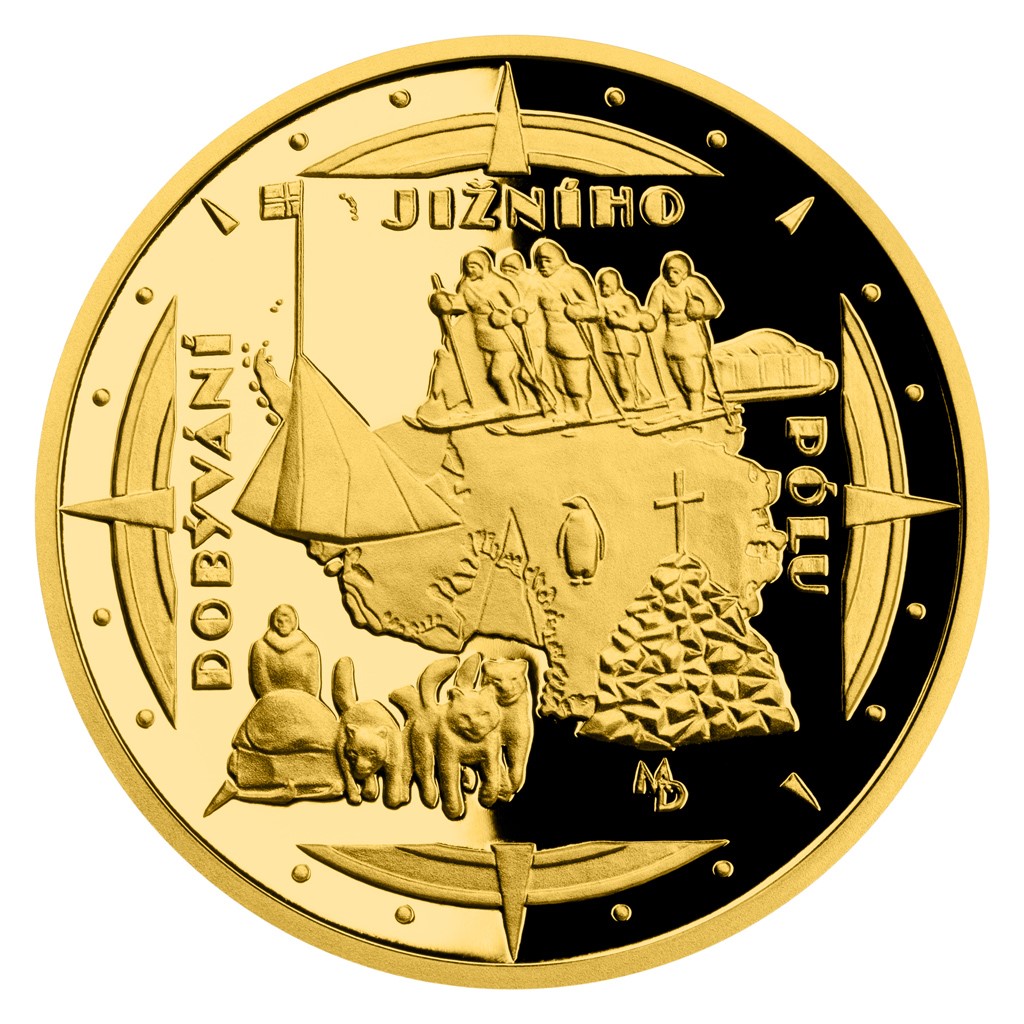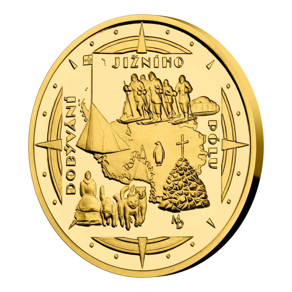 Druhá zlatá mince České mincovny z dobrodružného cyklu s názvem Polárníci připomíná dobytí jižního pólu.