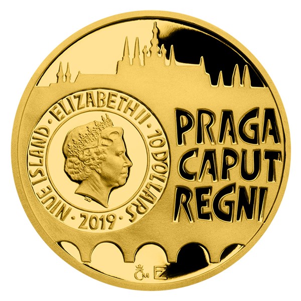 Reverzní strana mince, která je dílem akademického sochaře Zbyňka Fojtů, předkládá pohled na Staroměstskou radnici s orlojem. Kompozice je doplněna latinským opisem ANTIQUA CIVITAS PRAGENSIS (Staré Město pražské) a historickým znakem města. Ten je tvořený věžemi a branou, ze které vystupuje paže ozbrojená mečem – výjev odkazuje na hrdinnou obranu metropole za třicetileté války. Averzní strana je společná celé minisérii a předkládá pražskou siluetu (ohraničenou Pražským hradem a Karlovým mostem) doplněnou nápisem PRAGA CAPUT REGNI (Praha hlava království). Na averzu se nacházejí také atributy ostrova Niue – portrét a jméno královny Alžběty II., rok emise mince 2019 a nominální hodnota 10 DOLLARS (NZD) –, jehož licence České mincovně umožňuje razit vlastní pamětní mince.