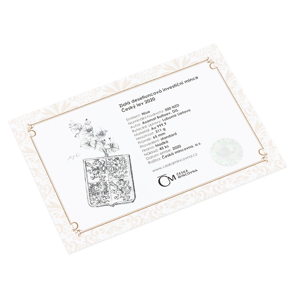 Proměňte své finance v 10 trojských uncí ryzího zlata – sofistikovaně a bez DPH. Celkový emisní náklad mince čítá 70 kusů, z nichž 45 kusů je k dispozici samostatně (dalších 25 kusů je součástí ucelených sad zlatých investičních mincí). Mince je uložena do luxusní dřevěné krabičky.