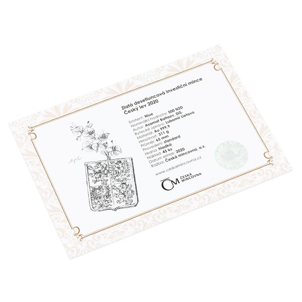 V roce 2020 dostaly všechny varianty investičních mincí České mincovny nový kabátek, ale hlavní myšlenka zůstala zachována. Vedle českého lva v netradičně realistickém podání předkládá reverzní strana zlaté mince ještě další dva symboly české státnosti – Svatováclavskou korunu, která spočívá na hlavě dvouocasé šelmy, a orlici na štítu, která je syntézou svatováclavského, moravského a slezského dravce. Autorem reliéfu je medailér Asamat Baltaev, DiS. Averzní strana nese atributy ostrova Niue, který České mincovně poskytuje zahraniční licenci k ražbě vlastních mincí – tj. portrét a jméno královny Alžběty II., rok emise 2020 a nominální hodnotu 500 DOLLARS (NZD). To vše je doplněno ještě lipovými ratolestmi.