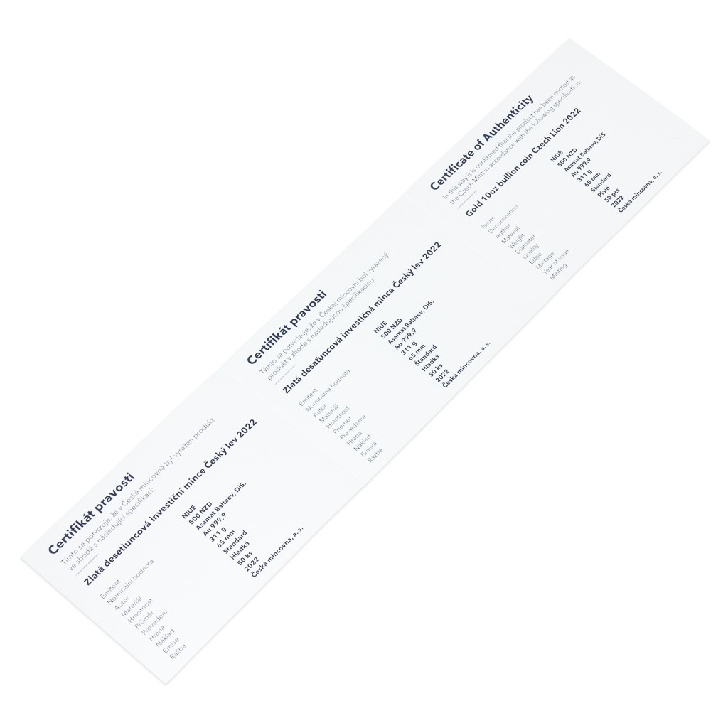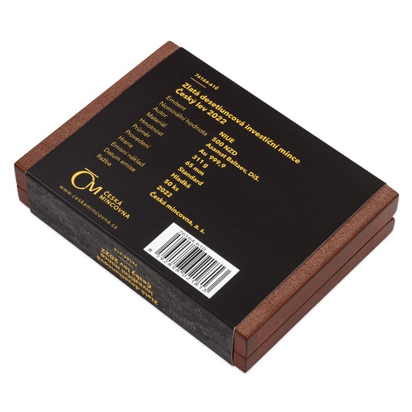 Světové investiční mince bývají věnovány silným národním symbolům a ani „Český lev“, který je první ražbou svého druhu určenou pro český trh, není výjimkou. Hmotnost zlaté mince České mincovny s ročníkem 2022 činí deset trojských uncí.