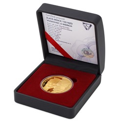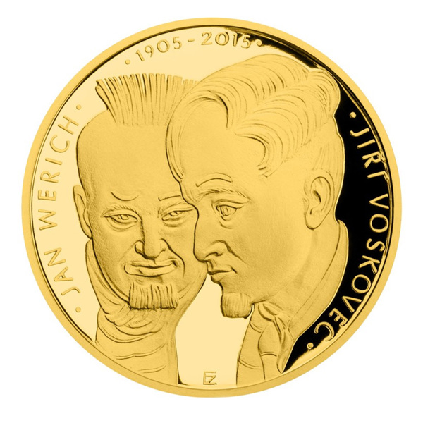 Dva slavní umělci, dvě velké tvůrčí osobnosti, dvě unce ryzího zlata. To vše se mistrovsky prolíná v nové úžasné zlaté dvouuncové minci 100 NZD. Vydává ji Česká mincovna při příležitosti 110. výročí narození Jiřího Voskovce a Jana Wericha v limitovaném nákladu 200 ks a mimořádné kvalitě PROOF. Autorem obou stran mince je akademický sochař Zbyněk Fojtů, jehož medailérská zručnost dala vzniknout dalšímu skvostnému uměleckému dílu nesoucímu kromě originálního zpracování zajímavého tématu rovněž nesporný investiční potenciál.