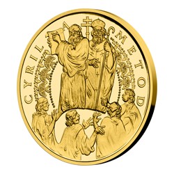 Zlaté mince České mincovny o hmotnosti dvou trojských uncí jsou tradičně věnovány velkým historickým dvojicím. V reliéfu první takové ražby určené pro slovenské sběratele a investory se objevují Cyril a Metoděj.