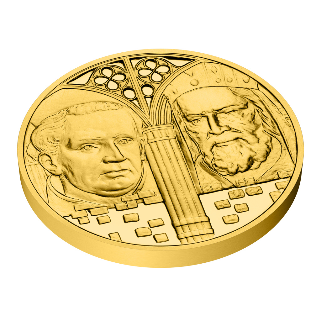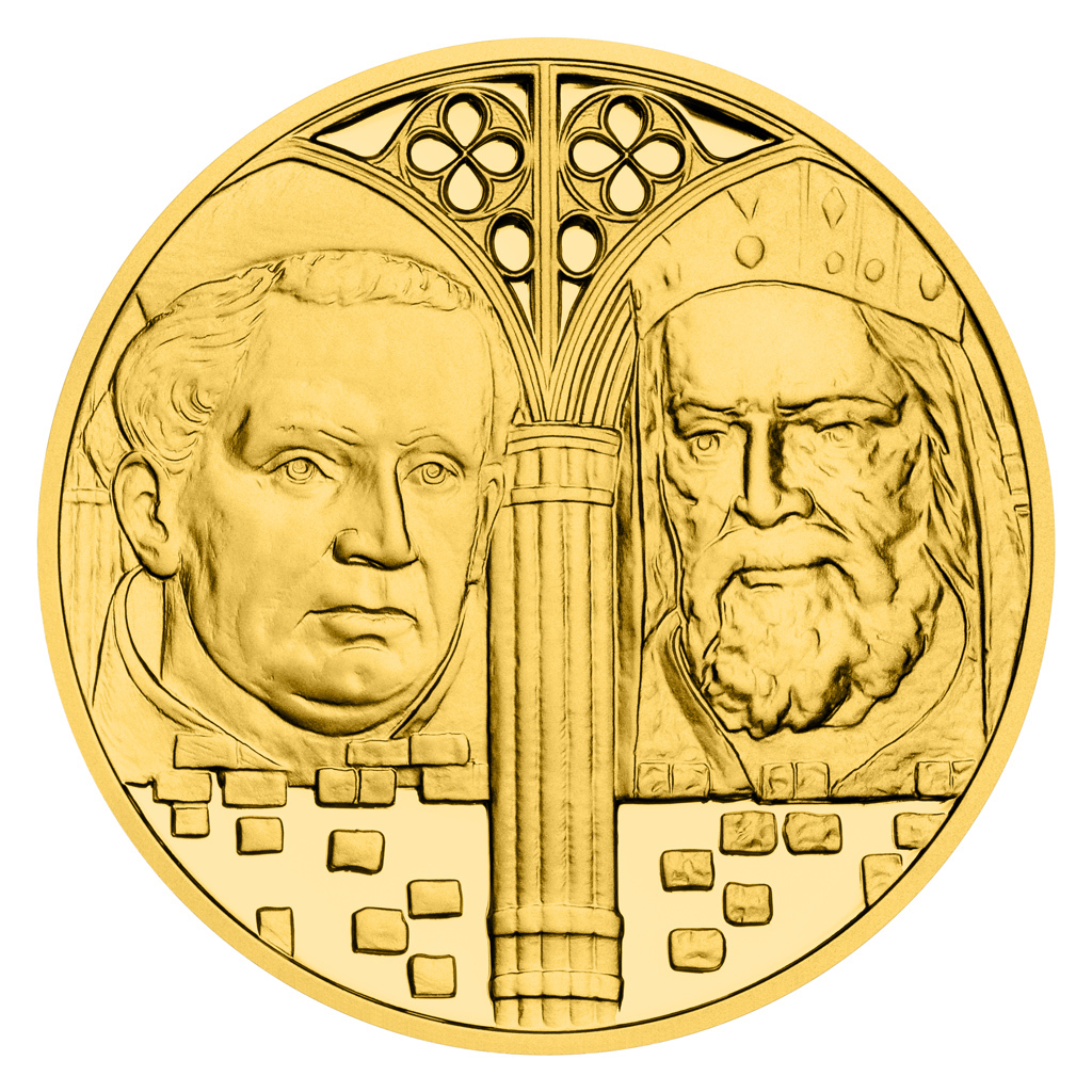 Karla IV., který je takřka bezvýhradně považován za největšího Čecha všech dob, není třeba představovat. Četné skutky, které mu zajistily titul „Otec vlasti“, by však nebyly možné bez přičinění muže stojícího po jeho boku – Arnošta z Pardubic. Oběma vzdává hold dvouuncová zlatá mince České mincovny z volného cyklu, který je věnovaný slavným historickým dvojicím.