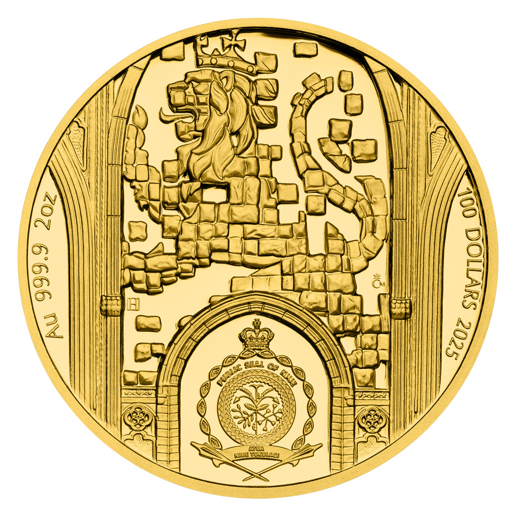 Na reverzní straně mince z ateliéru medailéra Jiřího Hanuše, DiS., najdete portréty Arnošta z Pardubic a Karla IV. zakomponované do gotické architektury. Kamenné bloky, které se od portrétů oddělují, symbolizují myšlenky a činy obou velkých mužů, které posloužily jako základní stavební kameny české státnosti. Z těchto padajících kamenů se pak na averzní straně mince postupně skládá dvouocasý český lev. Protože mince České mincovny vycházejí v zahraniční licenci ostrova Niue, nesou na averzu ještě jeho státní znak, nominální hodnotu 100 DOLLARS (NZD) a rok emise 2025.