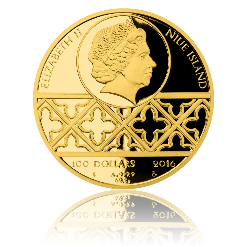 Oba velcí muži stojí bok po boku také na reverzu zlaté mince – korunované busty jsou doplněny jejich jmény. „Nejbližší jsou mi historická témata a nejraději tvořím portréty českých panovníků,“ říká autor výtvarného návrhu mince Jan Lukáš, přední český akademický sochař, který stál u zrodu jablonecké medailérské školy. „Snažil jsem se, aby Jan Lucemburský byl trochu víc raubíř,“ dodává se smíchem. Averz mince je pak věnován nezbytným atributům emitenta, nominální hodnotě 100 DOLLARS, roku emise 2016 a decentnímu gotickému ornamentu.