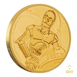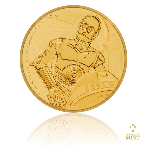 Mezi hlavními postavami vesmírné ságy Star Wars se nenacházejí jenom lidé, ale také řada mimozemšťanů a robotů, takzvaných droidů. První z oblíbené dvojice mechanických hrdinů – R2 D2 – již svou pamětní ražbu z drahého kovu získal a teď je řada na jeho kamarádovi. Protokolární droid C 3PO, jehož hlavním poznávacím znamením je zlaté šasi, se stal motivem zlaté mince.