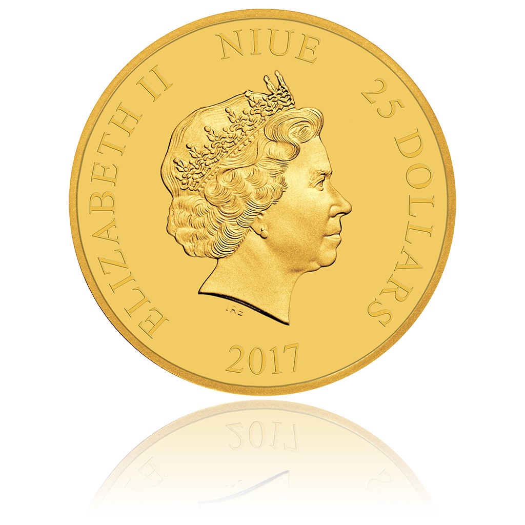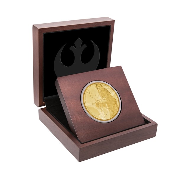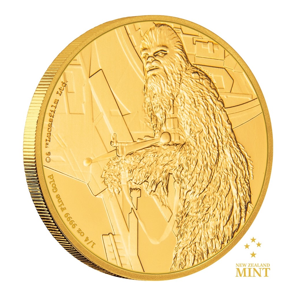 Hlavním motivem reverzní strany mince je scéna ze čtvrté filmové epizody – Chewbacca střelbou z kuše kryje ústup spolubojovníků na palubu své lodi Millennium Falcon. Vydavatelem mince je ostrov Niue, jehož atributy se objevují na averzní straně mince: jméno a profil královny Alžběty II., rok vydání mince 2017 a nominální hodnota 25 DOLLARS (NZD). Výtvarná podoba licencované mince je dílem uměleckého kolektivu Novozélandské mincovny.