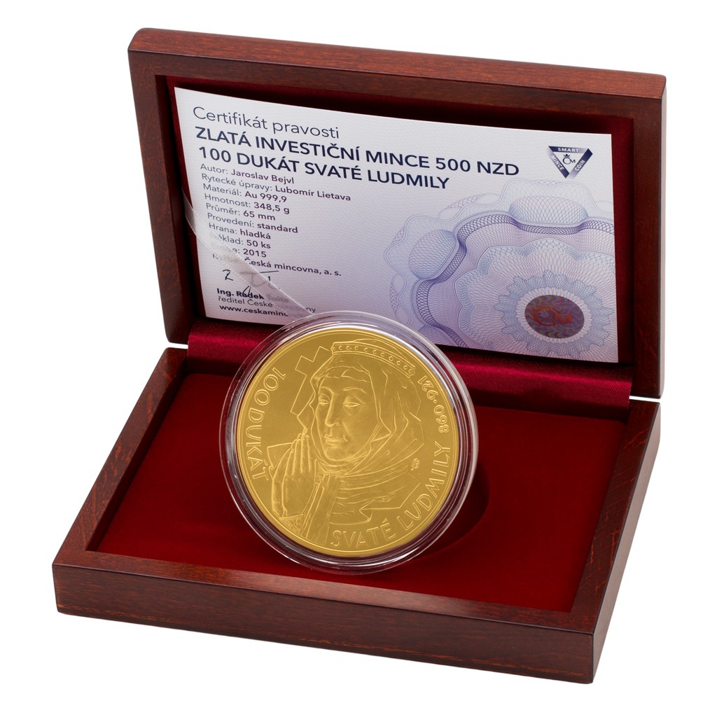 Nádherná investiční Smart mince 250 NZD o hmotnosti 100dukátu z ryzího zlata představuje velkou investiční příležitost ve spojení s duchovním poselstvím, které přežívá v srdcích souvěrců již více než tisíc let. Návrh mince pro Českou mincovnu zpracoval Jaroslav Bejvl, výtvarník s vytříbeným citem pro portréty a kompozici. Reverz věnoval portrétu světice. Averz mince nese vedle atributů emitenta plastiku hradu Tetína a Ludmilina hrobu spolu s šálou, která symbolizuje Ludmilinu smrt. Emise je omezena pouhými 50 kusy mincí, nečekejte tedy a investujte moudře v nebývale půvabném uměleckém zpracování.