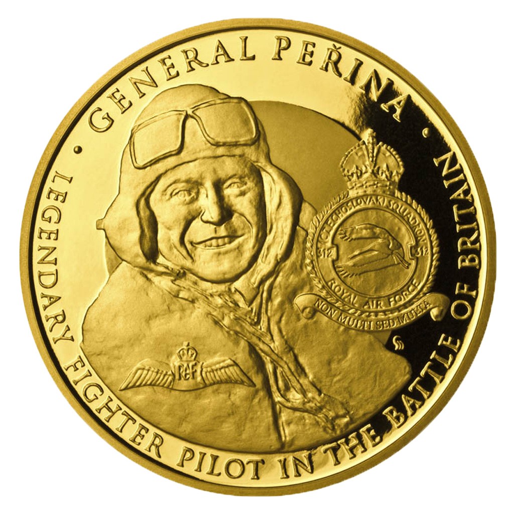 Generál František Peřina, český válečný hrdina, se narodil 8. 4. 1911 v Morkůvkách u Břeclavi. Byl stíhacím esem druhé světové války, jemuž přezdívali Generál nebe. Původně vyučený soustružník absolvoval v letech 1929–1931 Školu pro odborný dorost letectva VLU v Prostějově. Poté sloužil u letectva v Olomouci, kde se díky svým vynikajícím pilotním schopnostem zařadil mezi československou stíhací elitu. V roce 1937 reprezentoval Československo na IV. mezinárodním leteckém mítinku v Curychu. V červnu 1939 utekl z Protektorátu do Polska, aby na konci července odplul do Francie, kde vstoupil do Cizinecké legie. Po vypuknutí války byl v Chartres přeškolen na stroj Curtiss Hawk H. 75 C.1. a v prosinci 1939 poslán ke Groupe de Chasse I/5. U této jednotky povýšil na návrh kpt. A. Vašátka do hodnosti poručíka. Dne 3. června byl v leteckém souboji u Paříže sestřelen. Po mnohých peripetiích se mu podařilo vrátit ke své jednotce a poté přes Afriku do Velké Británie, kde se stal příslušníkem 312. československé perutě RAF. Během svého působení na ostrovech Peřina zasáhl do bitvy o Británii a poté se s letkou přesunul do Liverpoolu, kde působil jako doprovod lodních konvojů a bombardérů operujících nad Francií a Německem. Nejtěžší období zažil Peřina s příchodem komunismu v únoru 1948. V dubnu 1949 se mu za pomoci kamaráda podařilo emigrovat společně s manželkou ve sportovním letounu Sokol. Z Chocně všichni tři odletěli do obsazeného Německa a přistáli v americké zóně. Po několika letech strávených v britské RAF se Peřinovi přestěhovali do Kanady a USA. Do České republiky se vrátil až v roce 1993. Prezident Václav Havel mu propůjčil státní vyznamenání – Řád bílého lva za vynikající bojovou činnost. Generál Peřina zemřel 6. 5. 2006 v úctyhodném věku devadesáti pěti let. Jeho manželka Anna Peřinová-Klimešová, během války vězněná nacisty, zemřela jen o pár týdnů dříve. Na averzní straně mince je umístěn portrét královny Elizabeth II., v opisu pak stylizované siluety stíhacích letounů z druhé světové války. Na reverzní straně je dobový portrét Františka Peřiny se znakem RAF a 312. stíhací perutě, ve které Peřina působil. Limitovaný náklad 400 kusů.
