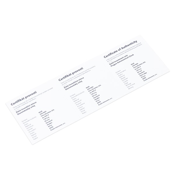 Staroměstský orloj, který každoročně obdivují miliony turistů z celého světa, patří k největším památkám staré Prahy. Hold mu proto vzdává velká zlatá mince České mincovny, jejíž hmotnost je odvozena od historických čtyřicetidukátů.
