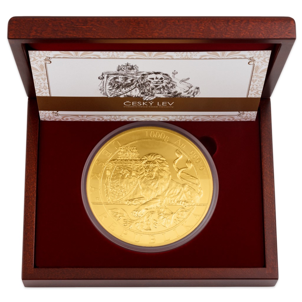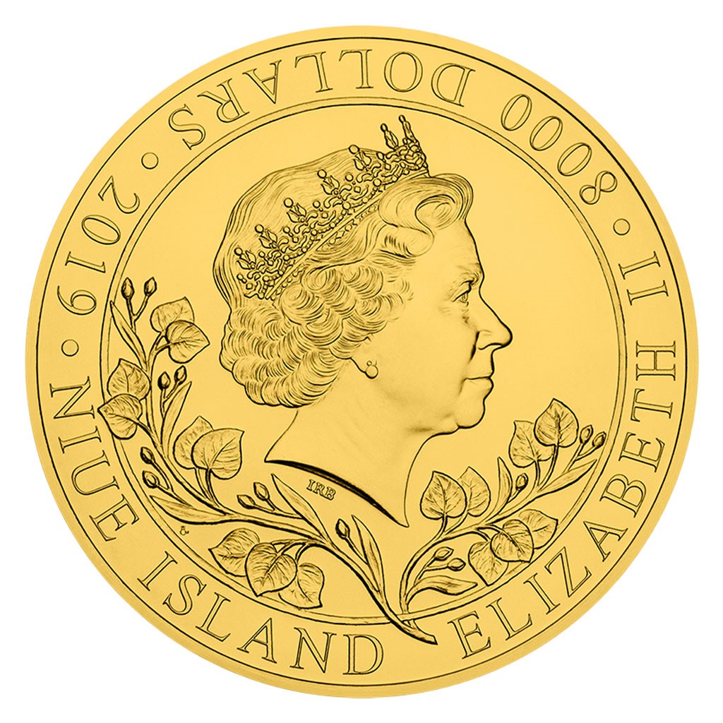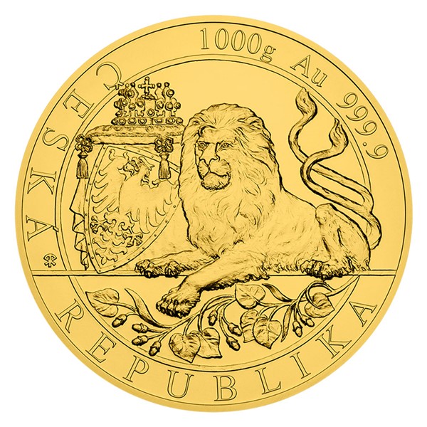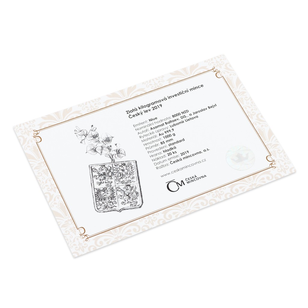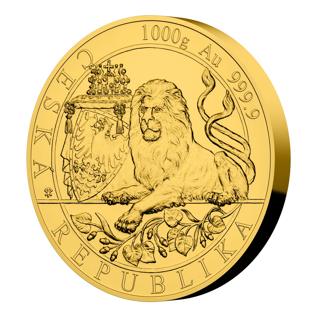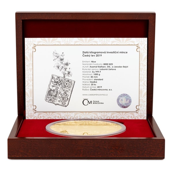Svůj majestát propůjčuje dvouocasý lev také zlaté minci. V roce 2019 dostal reliéf kilogramové ražby obměněný kabátek, ale hlavní myšlenka zůstala zachována. Netradičně realisticky vyvedený český symbol střeží další atributy naší vlasti – Svatováclavskou korunu na podušce a svatováclavskou orlici na štítu. Autorem původního výtvarného návrhu mince byl medailér Jaroslav Bejvl. Své dílo však před smrtí nestihl dokončit, a tak v jeho práci pokračuje Asamat Baltaev, DiS. Averzní strana mince je věnována nezbytným náležitostem ostrova Niue, který poskytuje zahraniční licenci k vydávání investičních mincí České mincovny: portrétu a jménu královny Alžběty II., roku emise mince 2019 a nominální hodnotě 8000 DOLLARS (NZD). To vše je doplněno ještě lipovými ratolestmi.