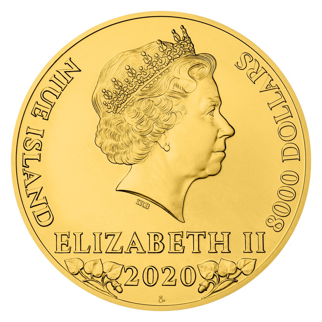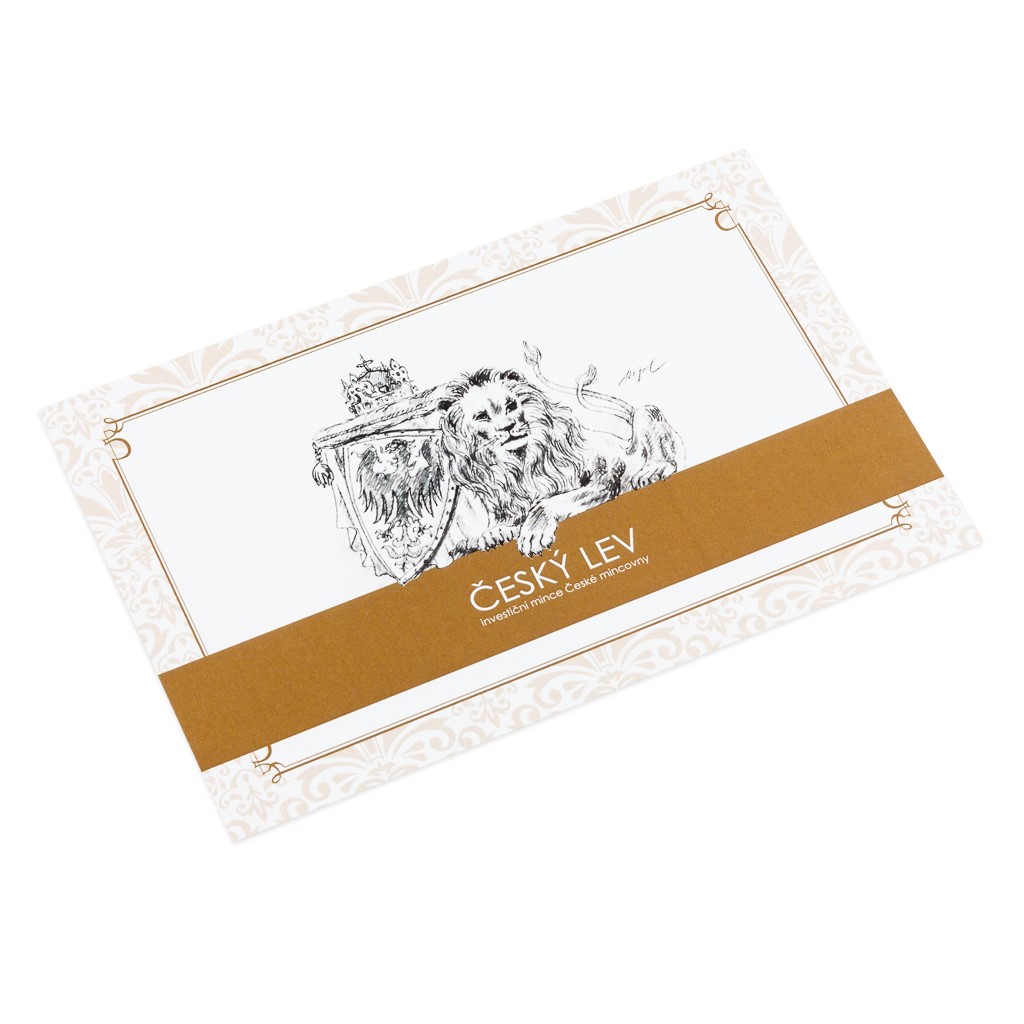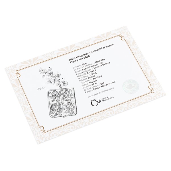Svůj majestát propůjčuje dvouocasý lev také zlaté minci. V roce 2020 dostaly všechny varianty investičních mincí České mincovny nový kabátek, ale hlavní myšlenka zůstala zachována. Netradičně realisticky vyvedený český symbol střeží další atributy naší vlasti – Svatováclavskou korunu, která spočívá na jeho hlavě, a orlici na štítu, která je syntézou svatováclavského, moravského a slezského dravce. Autorem reliéfu je medailér Asamat Baltaev, DiS. Averzní strana mince je věnována nezbytným náležitostem ostrova Niue, který poskytuje zahraniční licenci k vydávání investičních mincí České mincovny: portrétu a jménu královny Alžběty II., roku emise mince 2020 a nominální hodnotě 8000 DOLLARS (NZD). To vše je doplněno ještě lipovými ratolestmi.