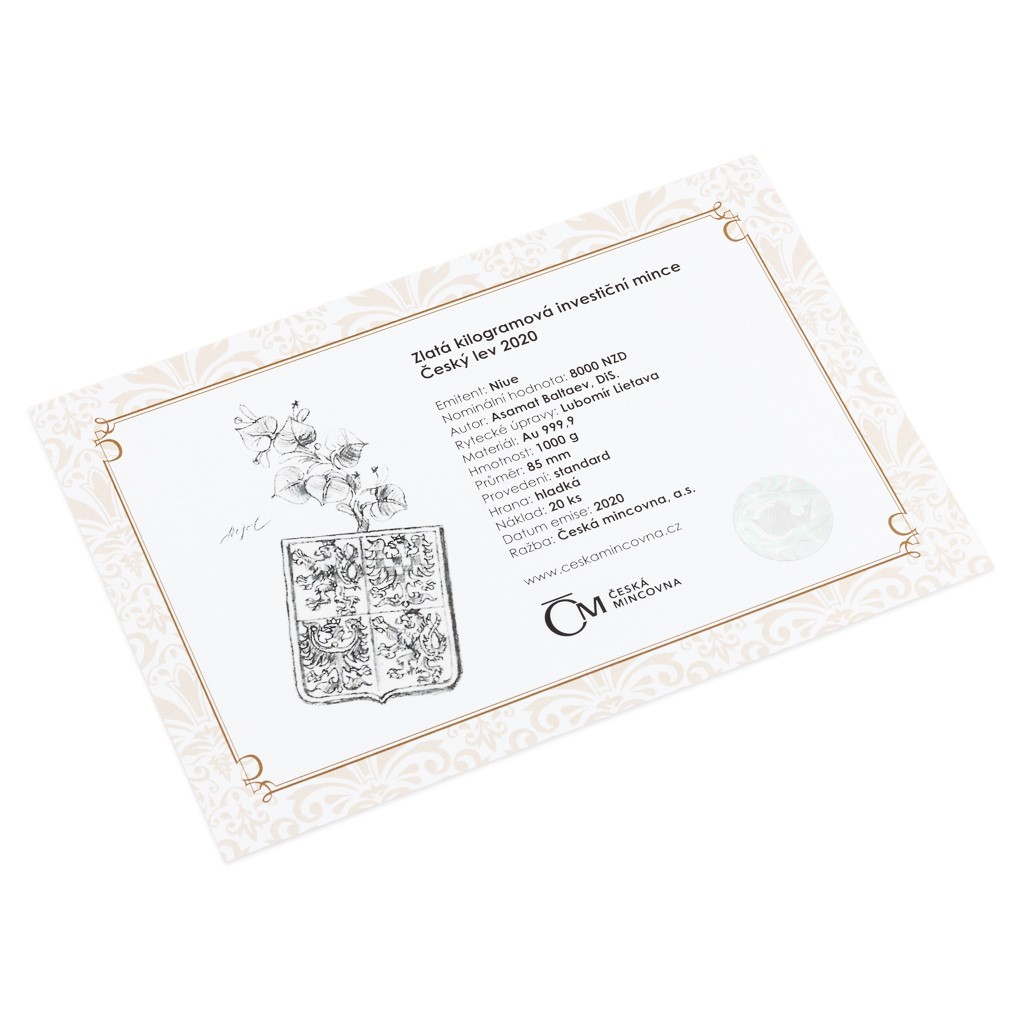 Zlatá kilogramová investiční mince Český lev 2020 stand